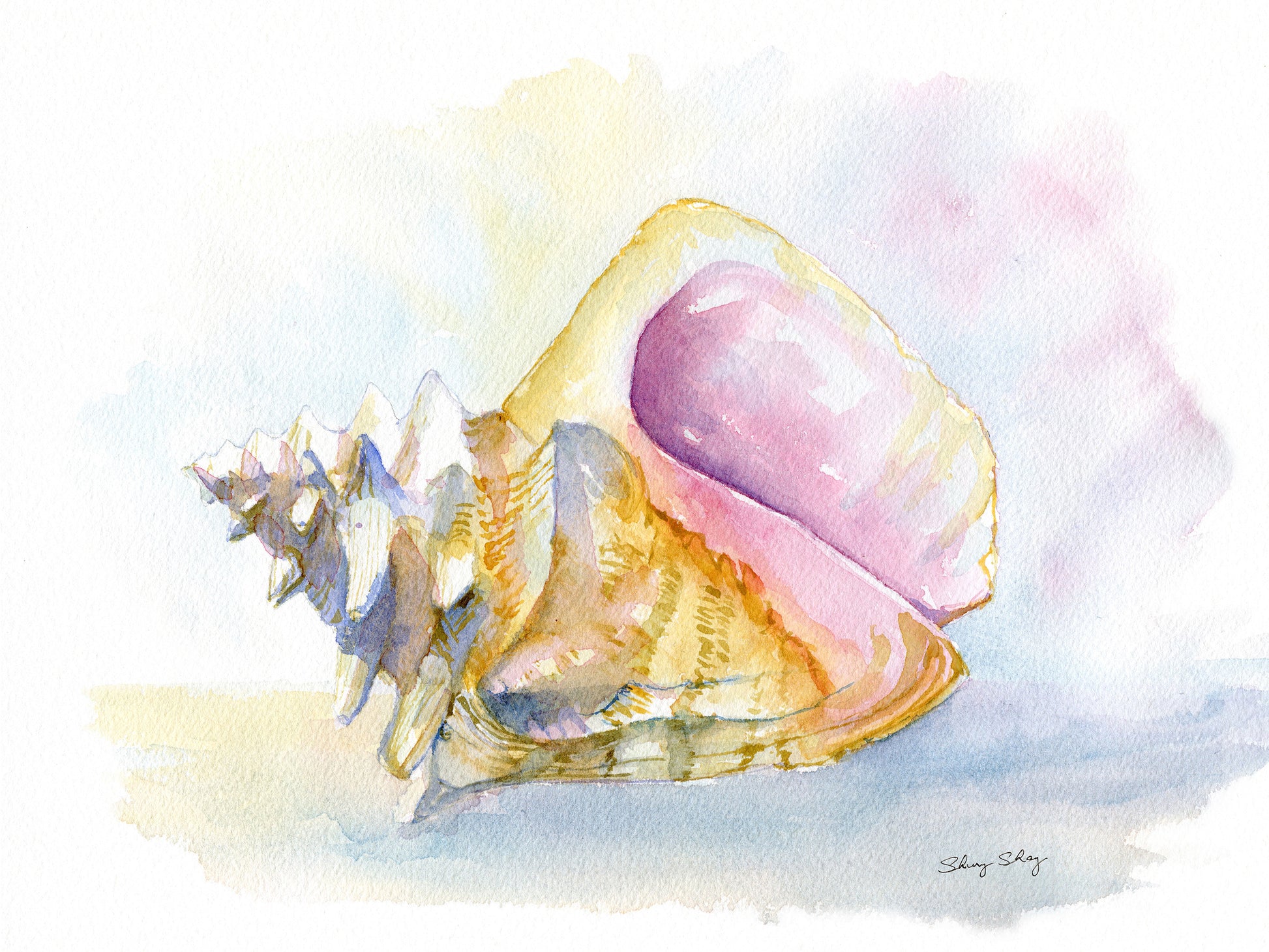 The conch shell and Its soft, pastel tones blend seamlessly, mimicking the subtle play of light and shadow on its smooth surface. This queen conch shell is delicately portrayed, with the intricate details of its ridges and grooves adding a sense of realism to the painting. The artist's skillful use of watercolors creates a sense of depth and movement, as if the shell has just been swept ashore by a gentle wave. The painting transports the viewer to a serene coastal setting, where the sound of crashing waves and the scent of saltwater fill the air.
