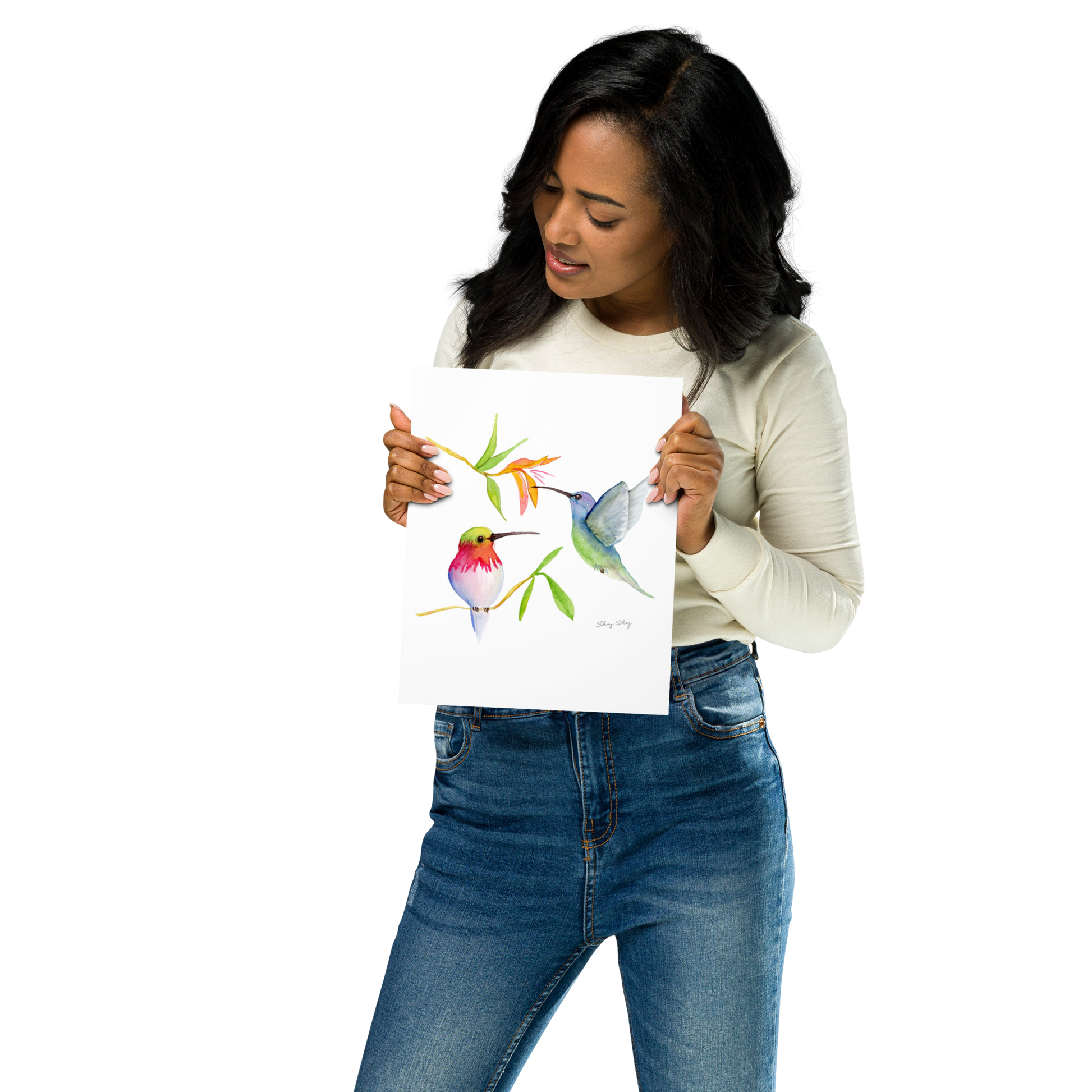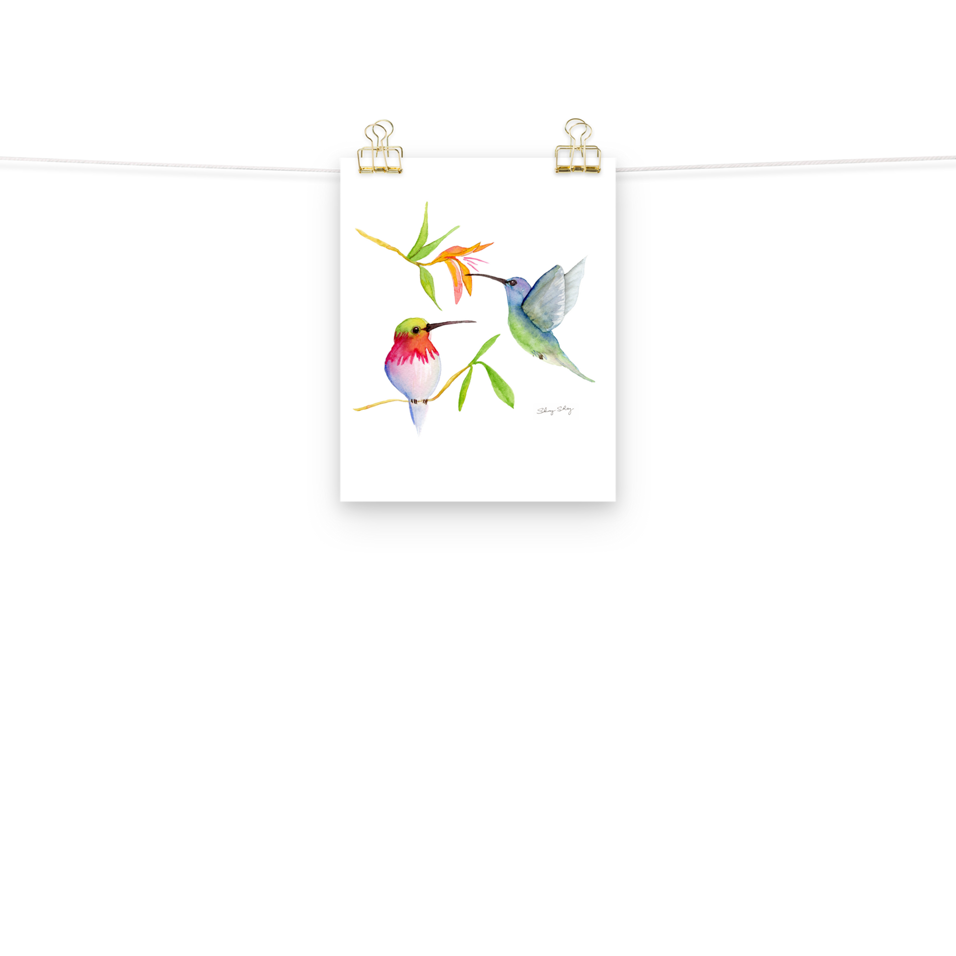 Print on archival paper is a giclee printing of original watercolor painting of HUMMINGBIRDS. Print size is 8 x 10 inches or 11x14. This is for a print only, frames shown are for display ideas only.