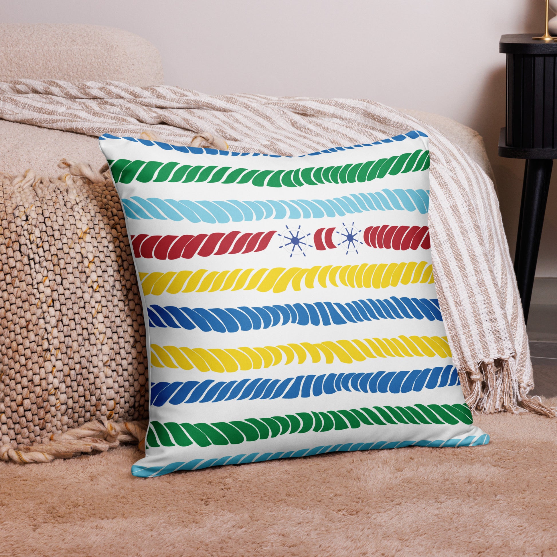 Ahoy, nap takers everywhere! Our Nautical Dream Pillow will set you sailing into dreamland on this comfy soft pillow. Featuring a vibrant design that will make any room feel like a seaside escape. This pillow showcases a playful pattern of colorful sailing ropes in blue, green, yellow, and red, with a charming ship steering wheel adding a touch of maritime magic. Available in three sizes so you can find your perfect fit.