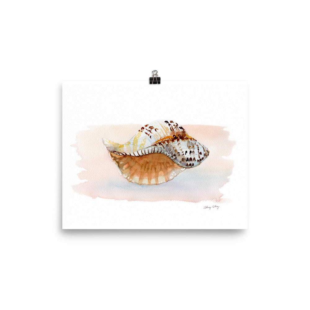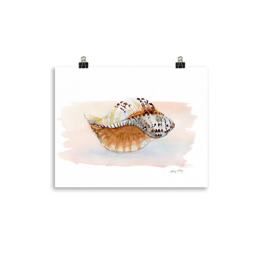 Order a print of this beautiful watercolor painting of a Triton Conch Seashell. This conch shell is part of a series of 4 different conch shells. Fun little coastal prints with natural colors and a little bit extra. The print is available in several sizes as a print only which you can frame to your liking.